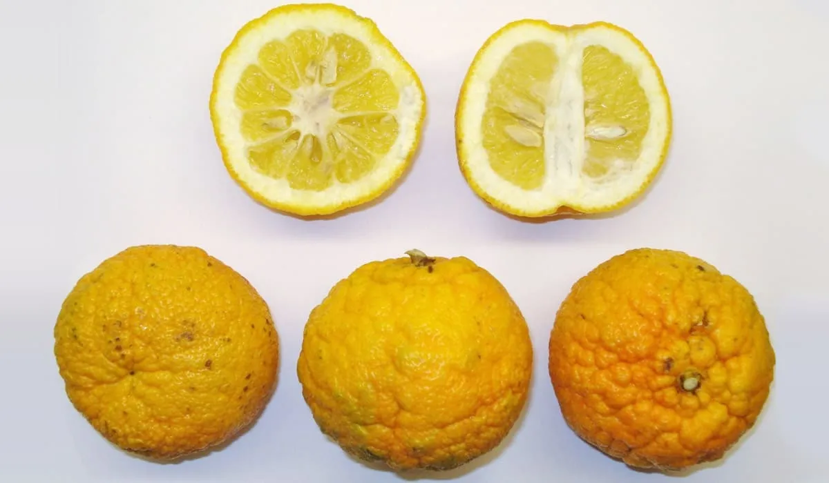 Le fruit ressemble à l'orange bien qu'ayant une épaisse écorce plus rugueuse, parfois verte, jaune ou orange. Il peut être mûr et avoir une écorce verte. C'est d'ailleurs le cas en Martinique. Sous son épaisse écorce blanche, elle renferme diverses tranches emballées dans une fine peau blanche. La pulpe de couleur jaunâtre possède beaucoup de pépins.