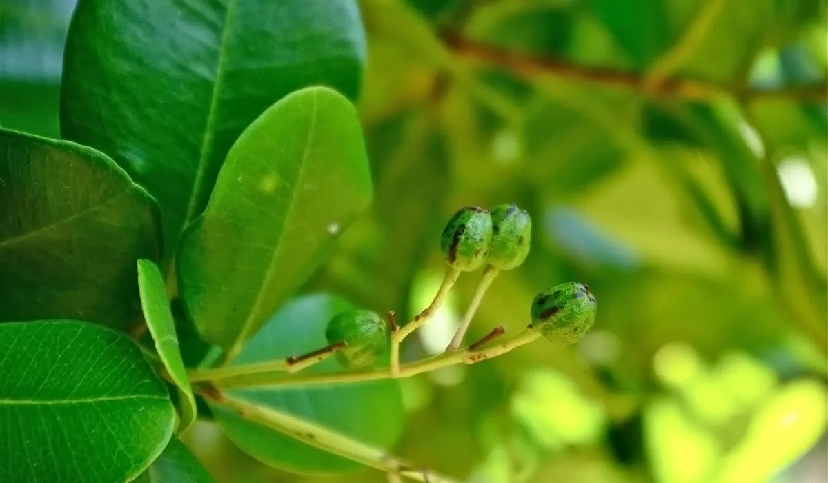 This tree can grow up to 20 meters tall when found in areas with abundant rainfall. Its leathery, aromatic leaves are long and rounded, measuring about 4 to 15 cm, green in color and turning yellow as they dry. The fruit is oval, black, and no more than 1 cm long.