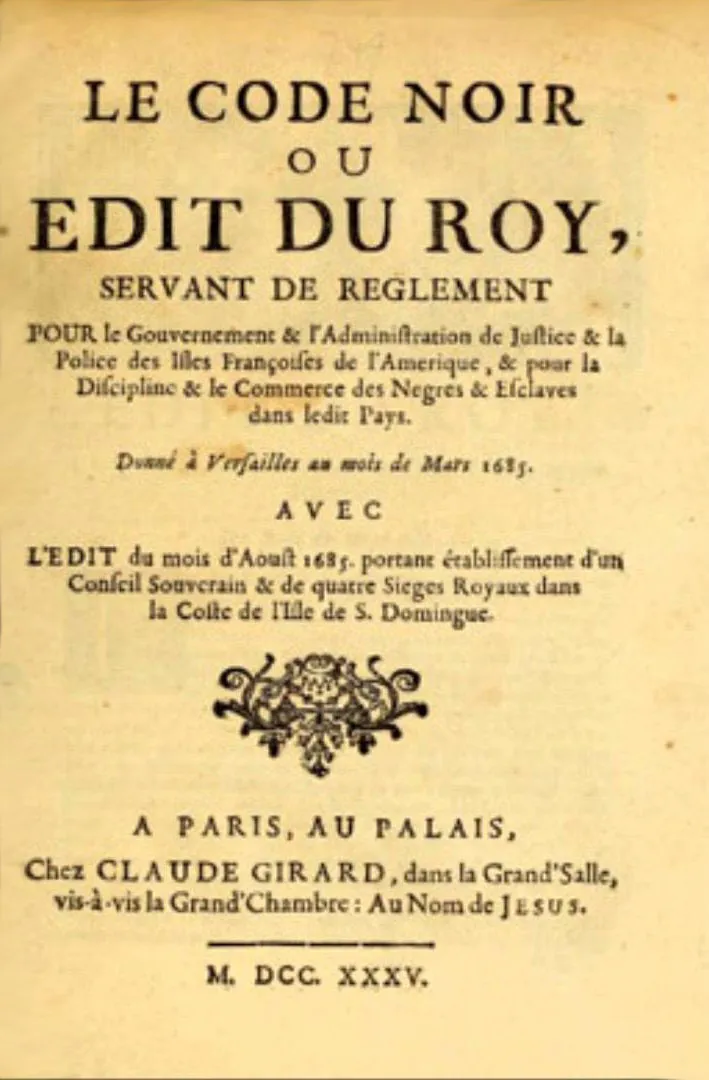 First planned to prohibit the abuse and mistreatment of slaves on plantations and to suppress illegal trade between Africa and the West Indies, the Code Noir of 1685 became more of a text to regulate and institutionalize slavery. In 1724, the second version of the text made legal the practice of slavery.