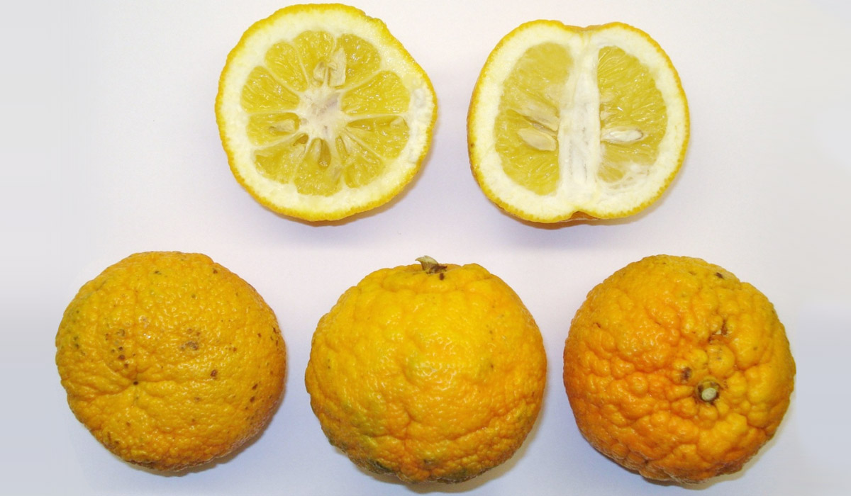 Le fruit ressemble à l'orange bien qu'ayant une épaisse écorce rugueuse, parfois verte, jaune ou orange. Il peut être mûr et avec une écorce verte. C'est d'ailleurs le cas en Martinique. Sous son épaisse écorce blanche, elle renferme diverses tranches emballées dans une fine peau blanche. La pulpe de couleur jaunâtre possède beaucoup de pépins.
