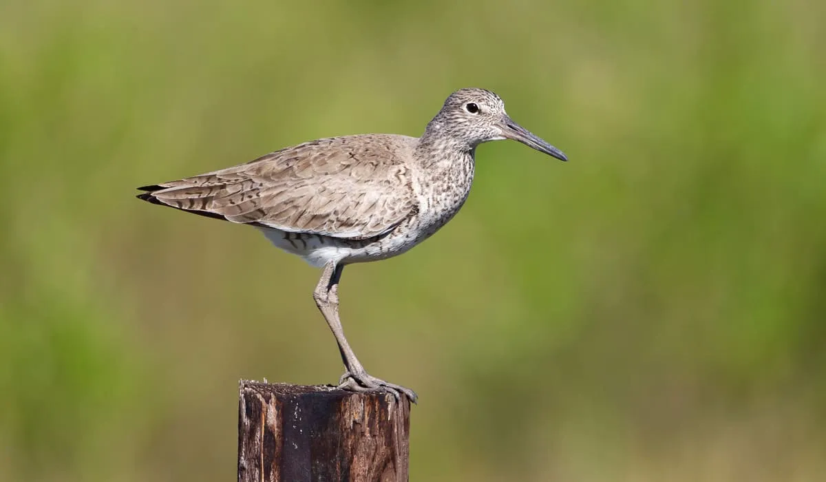 C'est un oiseau avec de longues pattes. Il a les parties supérieures grises, les parties inférieures blanches et est légèrement rayé sur les flancs. Au repos, il apparaît gris.