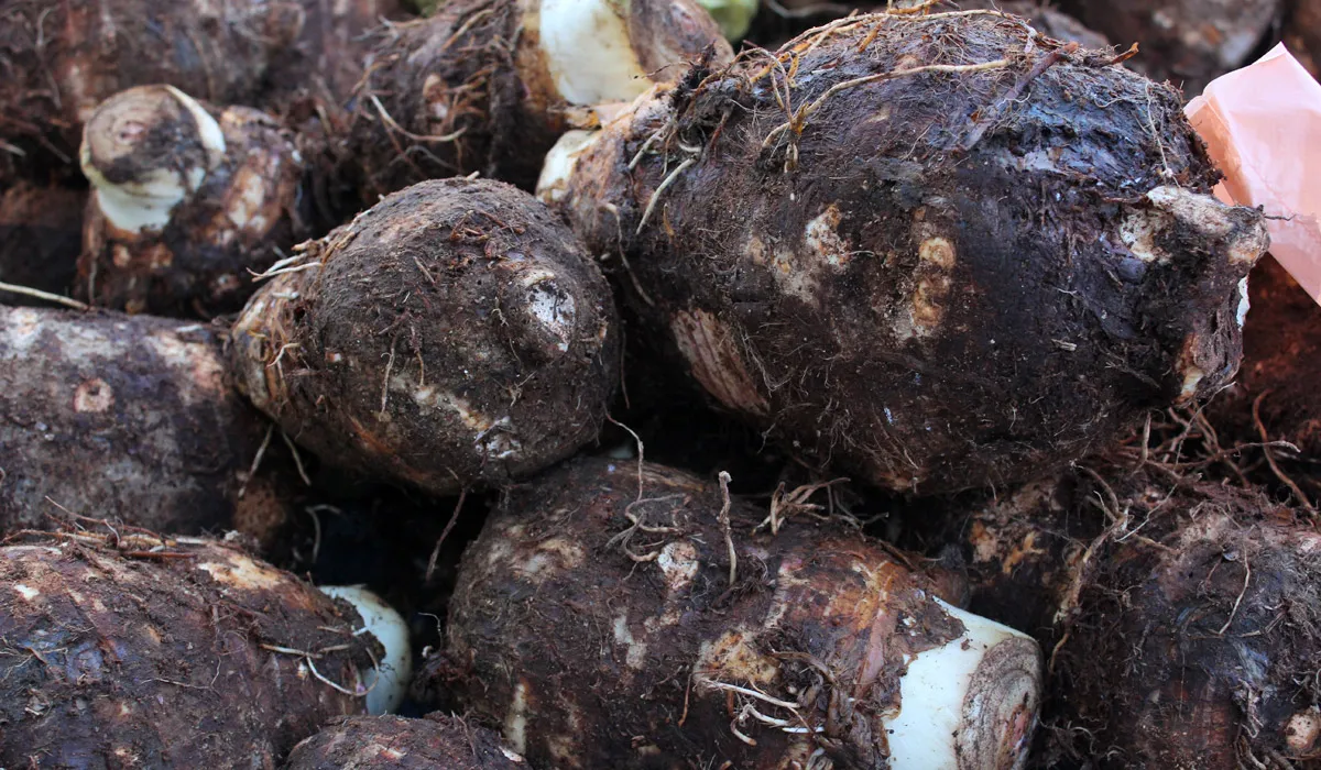 "Dachine" (in French but same pronunciation as the English word) comes from the English "dasheen". Dasheen is a tropical plant of the family Araceae (Colocasia antiquorum); the edible rhizome, taro, provides a starchy flour. It is widely consumed in the Caribbean where many varieties of dasheen plates are present on local tables.